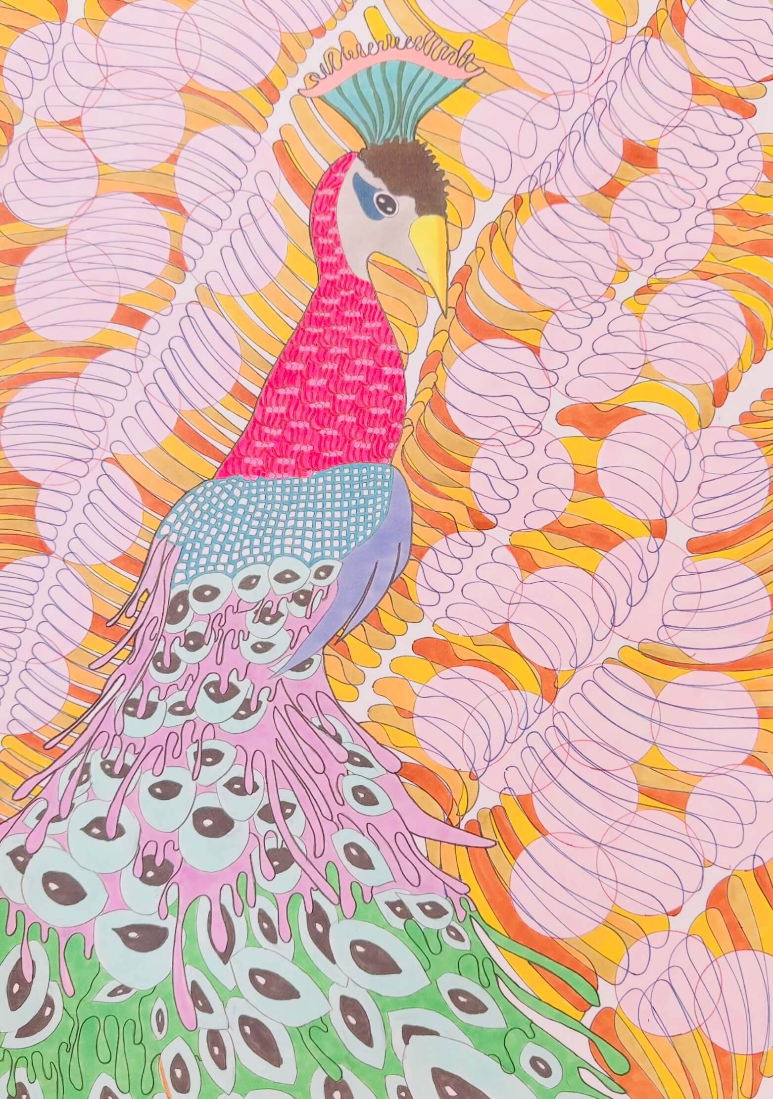 この絵はカラフルな孔雀を、自分らしい模様で表現しました。羽の部分は色をたくさん重ねて、動いているみたいな流れを出すことを意識しました。細かい模様や丸い形を一つずつ丁寧に描いたので、とても時間がかかりました。背景も明るい色を使って、全体がにぎやかで元気な雰囲気になるように工夫しました。